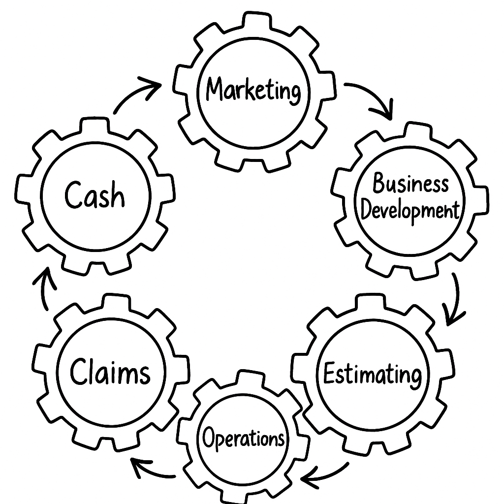 Because flywheels aren’t isolated. The output of one feeds directly into the next. A well-designed marketing campaign generates leads for Sales. Sales wins create estimating or delivery work. Delivery drives cash collection. If Marketing stalls, Sales starves, Estimating has no work, and your Cash flywheel grinds to a halt.